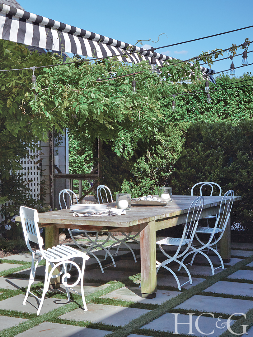 Vintage French patio chairs surround an alfresco dining table.