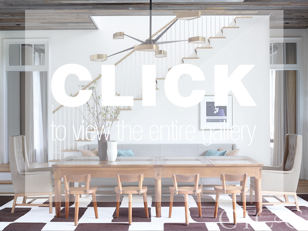 “A lot of different materials can be tricky, but nothing is fighting here,” says Egan. “The kitchen glows and is serene. It’s designed to live how they live. It wants to be elegant but also relaxed.” Throughout, the interiors echo this sentiment as nothing is too formal, and a disparate mix of furniture looks cohesive thanks to clean lines and natural textures. One side of the great room holds a large antique money table with inset leather-paneled compartments surrounded by hand-carved-oak, three-legged midcentury chairs and a pair of Swedish armchairs covered in putty-colored Rogers & Goffigon leather. An oversized spider chandelier hangs from the barnwood ceiling. On the opposite end, Egan’s ability to mix contemporary with warmth and pizzazz is evident in her attention to detail: A custom sofa sits on round oak legs inset with suede caps, while the facing armchairs have polished nickel sabots. Leather trims yellow pillows, and a coffee table has subtle shine with a bronzed smoked glass top. “It’s a mix of Scandinavian, midcentury, European and contemporary pieces, but each piece is minimal, so that it keeps it very chic and simple,” says Egan.