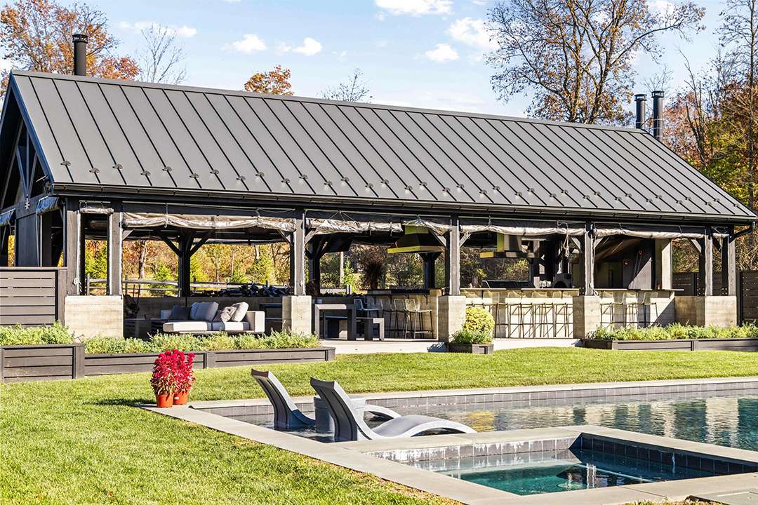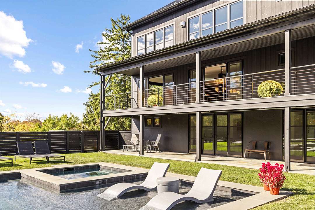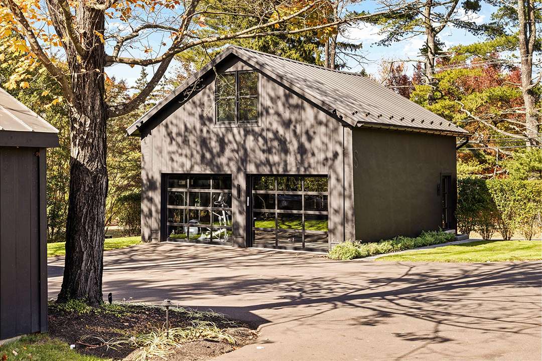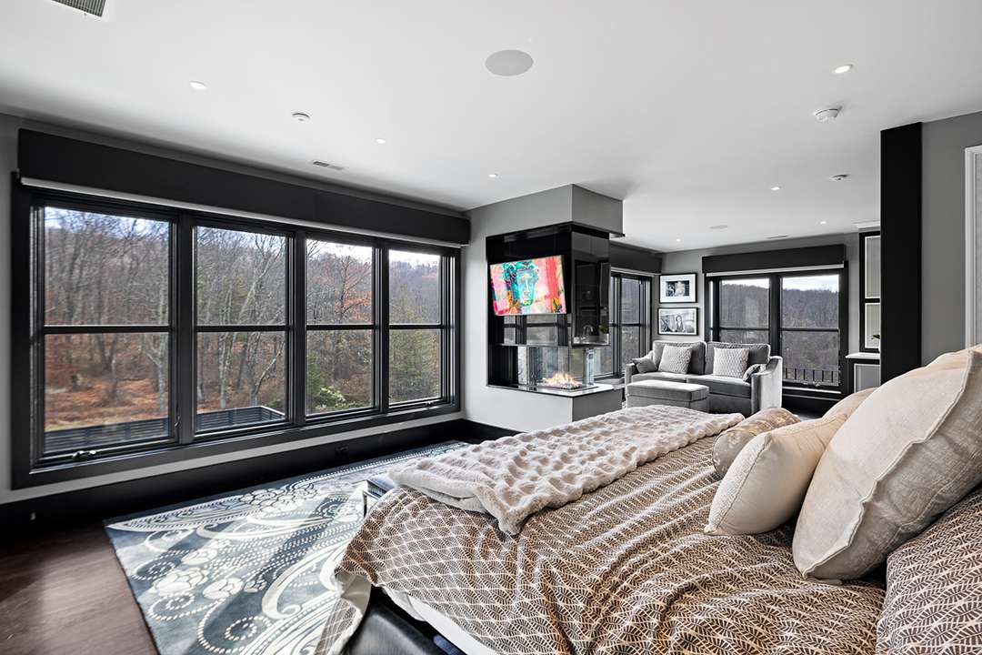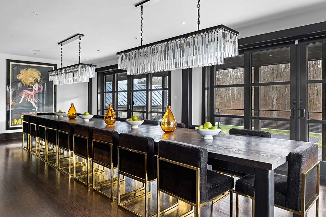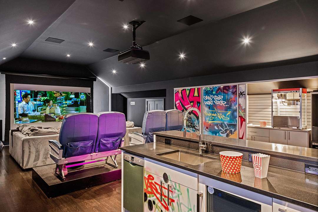 The 9,800-square-foot residence sits on over 10 acres and was built in 2021. In the modern farmhouse main house, interiors are dramatic and sleek with contrasting black and white elements as well as many finishes that sparkle. Art Deco-esque wallpapers flow across the main floor, which features multiple jaw-dropping areas to watch the game. Festivities can begin in the bold kitchen and dining room with enough space to hold an entire starting lineup. Guests can also flock to the 1,300-square-foot event pavilion where a skilled foodie could be working the custom smoker chefs, hibachi tables, or pizza oven while people watch the game near the suspended fireplace imported from France. Back inside, the colorful home theater and game room are other clear destinations for sports watch parties.