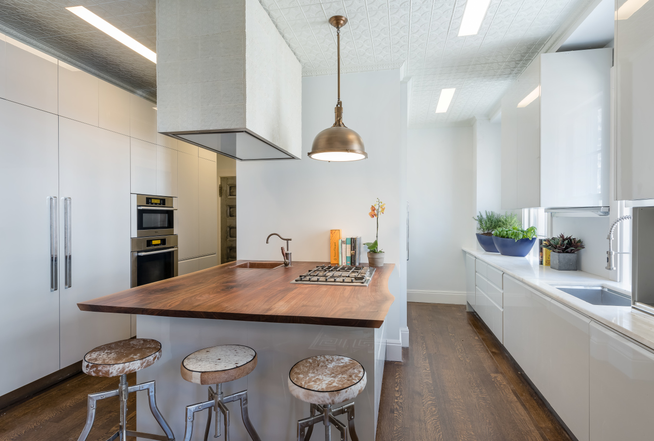 The chef’s kitchen features such luxurious details as custom Italian Molteni cabinets, a fleur-de-lis tiled hood, Bosch and Miele appliances, a live-edge black walnut entertaining island and Namibian marble countertops.