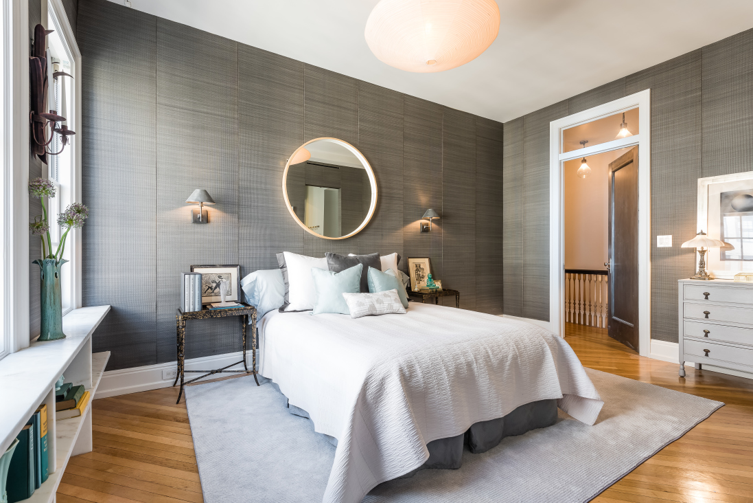 Two of the bedrooms are located on the first floor and the other three are located on the second. Among the latter is the serene master suite, which features horsehair upholstered walls and a spa-like master bathroom.