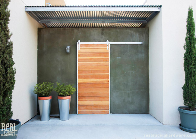 This farmhouse-chic piece is ideal for indoor or outdoor use and is made in the U.S.A. from Western red cedar. The horizontal plank design is mounted on a stainless flat track with Real Sliding hardware. Sliding barn door and track, starting at $1,361, realslidinghardware.com