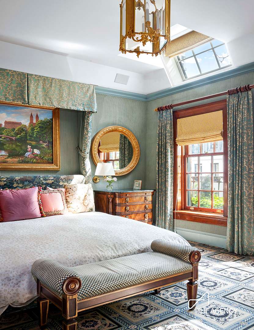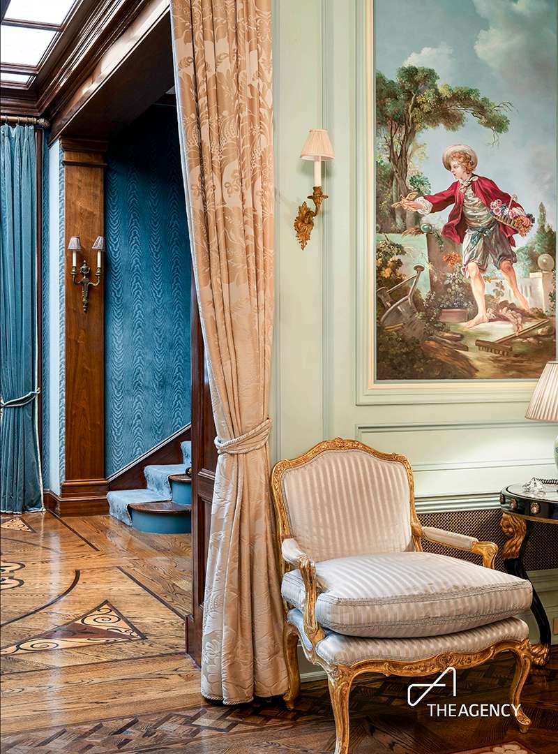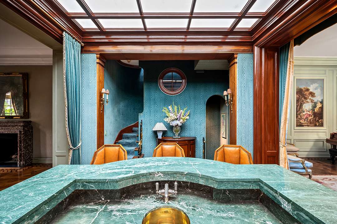 The 8,000-square-foot residence once benefited from a redesign by architect R.D. Graham, while Ron Bricke is responsible for the elegant and vibrant interiors. Walking through the grand home, you may be captivated most by the rich woodwork, playful color choices, or one-of-a-kind details. Some standout elements include original pine from 1872 in the library, a Belle Epoque American walnut bar with a crystal ceiling above it, and exquisite chandeliers. Another treasure is a circa-1750s tapestry in the dining room meticulously restored by the Metropolitan Museum of Art. All of this can be acquired by the next owner for a price.