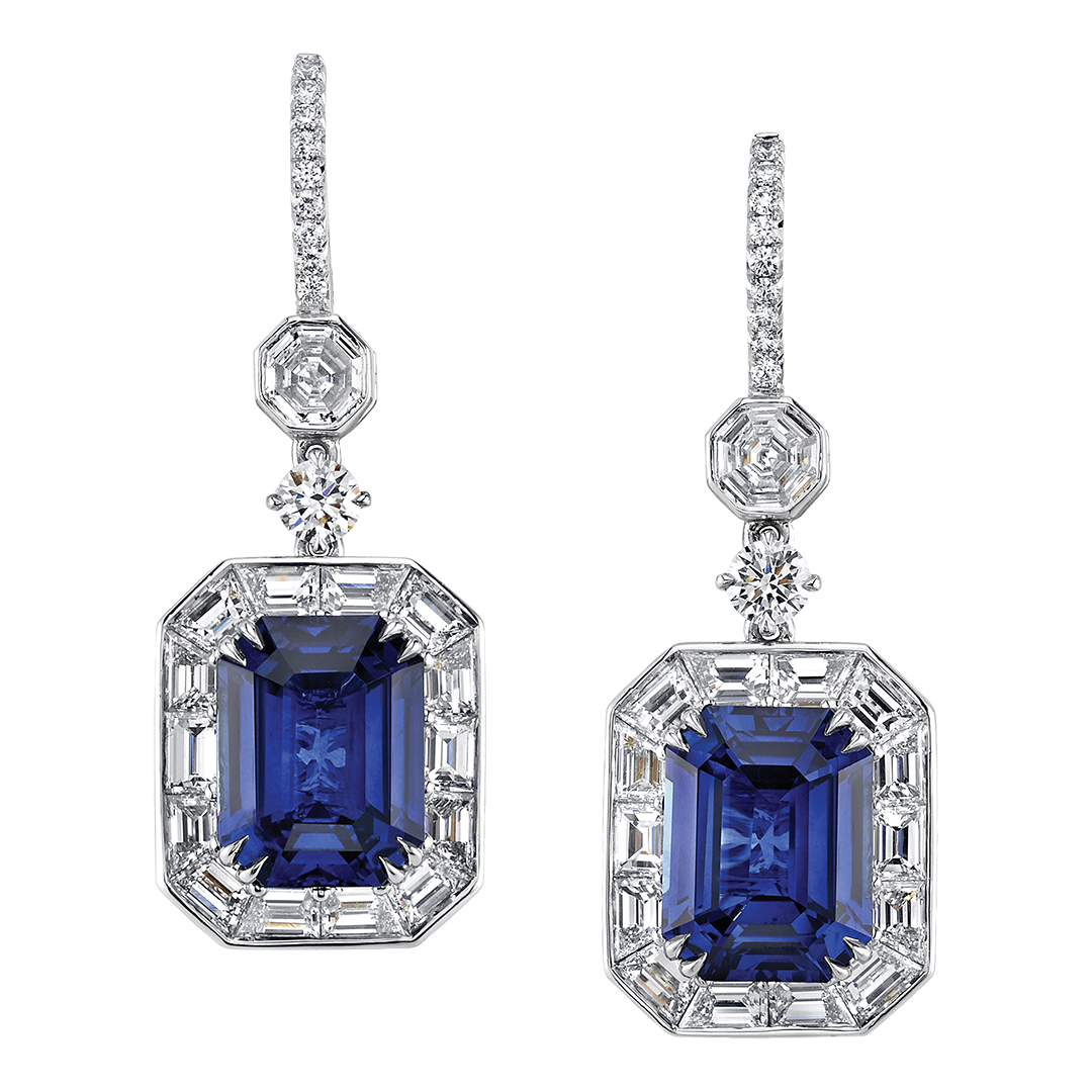 Omi Privé’s sapphire and diamond earrings are set in platinum, featuring 9.07 carat emerald sapphires, accented with diamond baguettes. Price upon request, available through Lux Bond & Green, lbgreen.com.