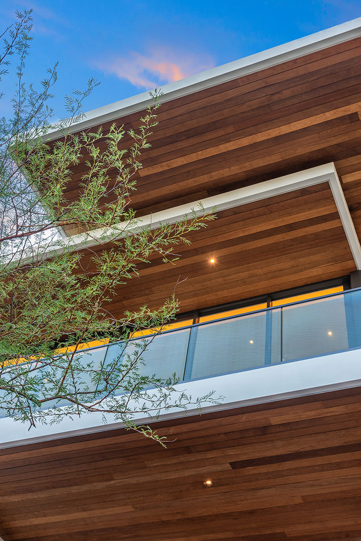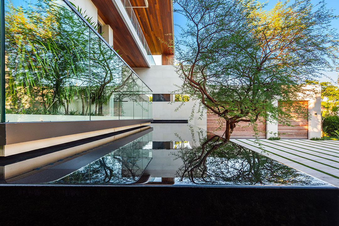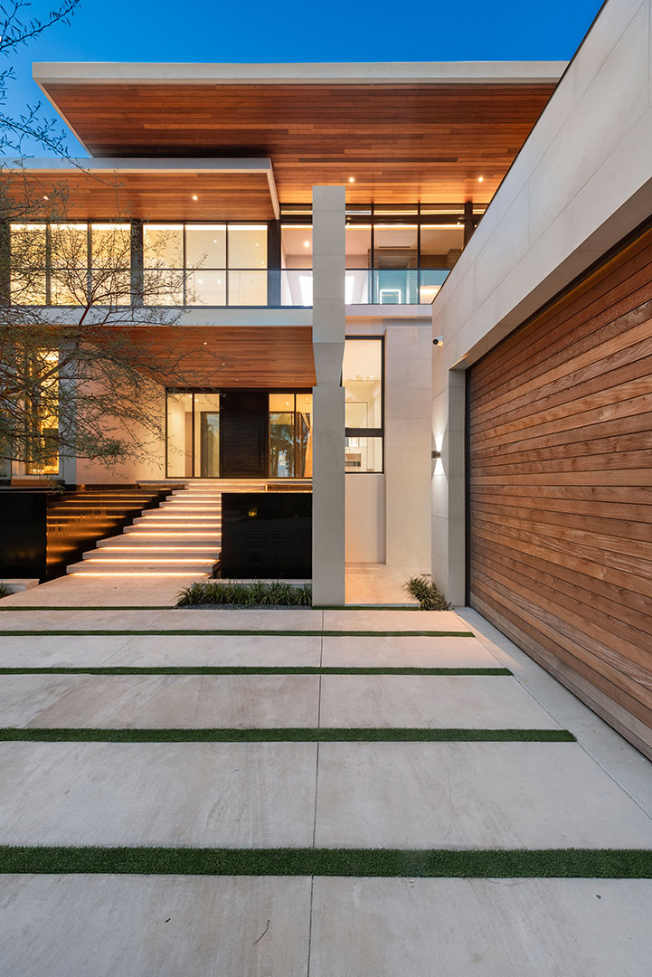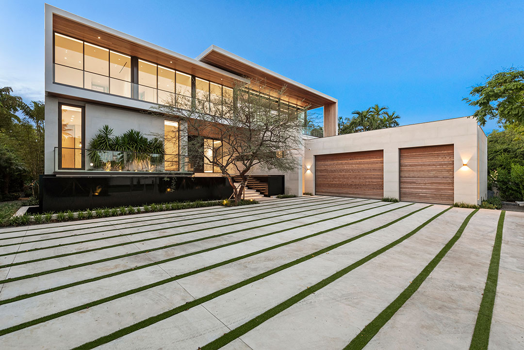 Their new 14,270-square-foot modern on Biscayne Bay was designed by Miami-based Choeff Levy Fischman Architecture + Design and built by Bart Reines Luxury Homebuilder. “We crafted this Tropical Modern home with a sophisticated blend of materials, including Ipe wood, Perlato marble, dark bronze doors and window frames, and metal accents,” says Raphael Levy, a principal at the firm. The rich interiors are by Antrobus Design Collective.