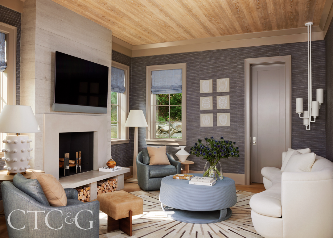 In choosing timeless but playful pieces like the Dmitriy & Co. chairs in the family room, the design team used sophisticated yet quirky elements to match the couple’s vibrant personality. A pragmatic Nobilis wallcovering masquerades as wood beams overhead, and an oversized white fireplace offers a cozy touch. Woven Omexco Paperweave wallcovering adds dimensional texture, while a raffia coffee table sports a customized periwinkle hue, which is also seen in the geometric pattern of the cordless window shades.