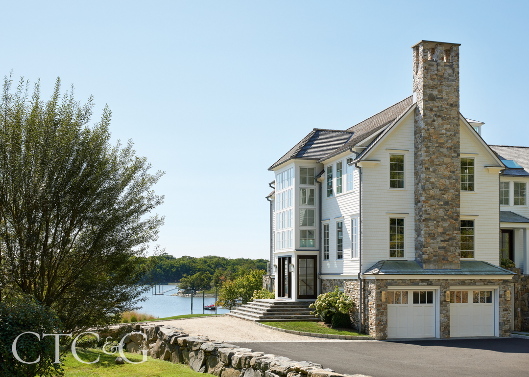 Throughout their design journey, the fun-loving couple showed an affinity for colors inspired by their waterfront property. “The homeowners love cool colors—blues and water colors of all shades,” says Mazzarini. “We took our inspiration from the views of Long Island Sound.”