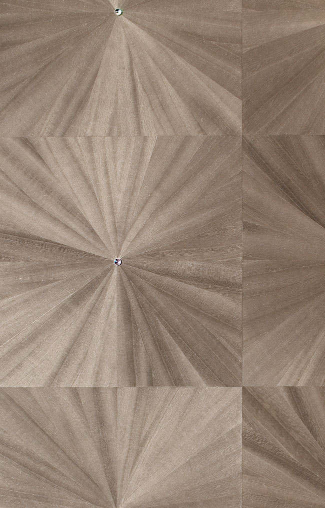 Unexpected Texture | Ajiro Sunburst, wood veneer with crystallized Swarovski clear crystals, MAYA ROMANOFF, available through Bergamo Fabrics (T), D&D, (212) 888-3333, mayaromanoff.com. (T) = to the trade.