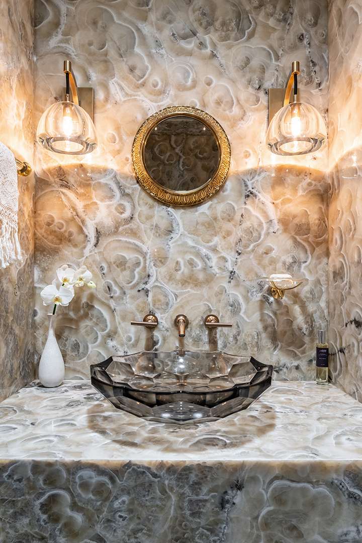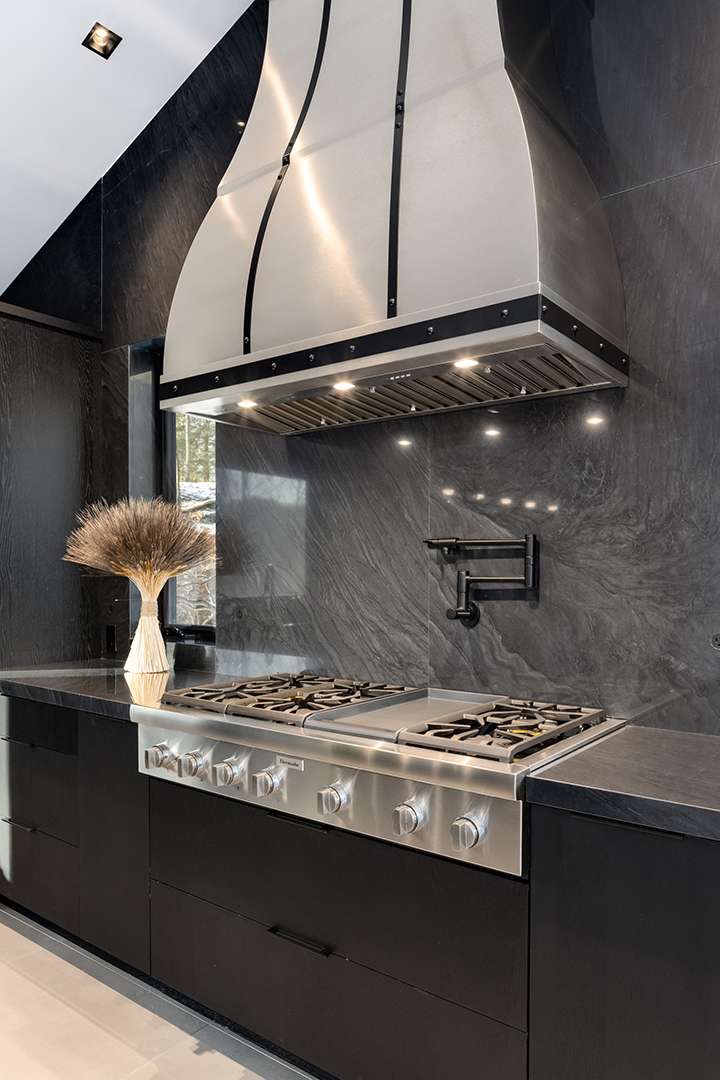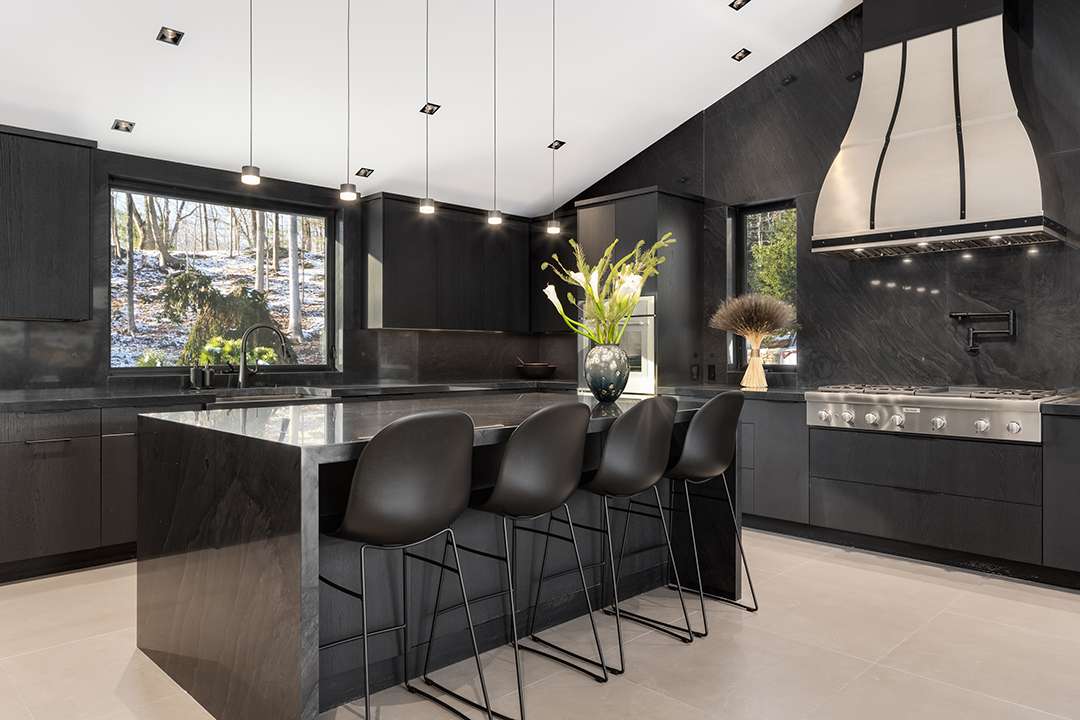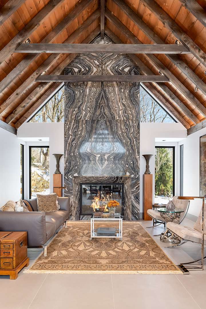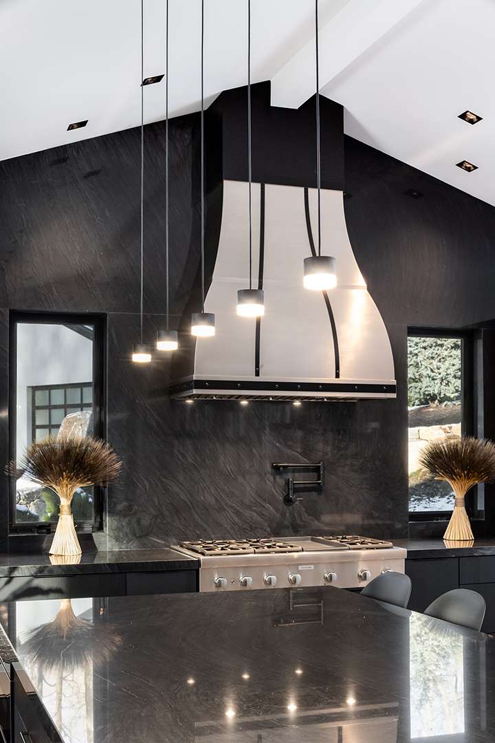 The open and glassy atmosphere that modern homes are known for is in full force here, with a nice touch of mountain house-like warmth, too. There are A-frame ceilings in many of the rooms. The fireplace in the living room is truly a show-stopper, outfitted in marble and cascading all the way up to the ceiling. Accented by wood beams and tiled floors, the sophistication moves into the sleek black marble kitchen and dining room featuring custom millwork. While the majority of the spaces sit on the first level, including a dreamy primary retreat, two additional bedrooms and a kitchenette can be found on the lower level.