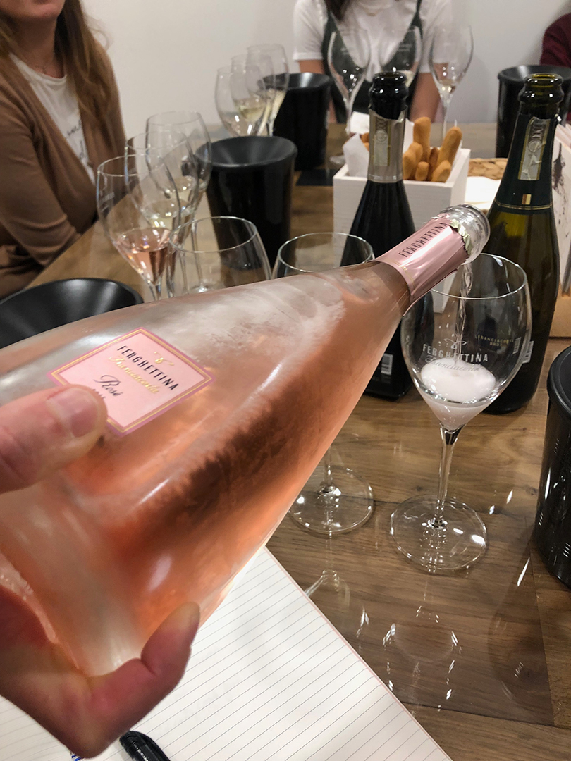 Tasting of the Franciacorta Rose Brut Cocg. Currently available in the U.S., the wine is made with 100% pinot grapes that is processed for 36 months.