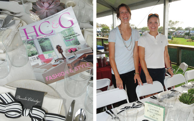 The tents were abuzz with anticipation at September’s Hampton Classic—not only for the thrilling show-jumping competition, but also for the inspiring table decorations dreamed up by Grand Prix event attendees. At the HC&G table, designer Lynn Butler Beling of the Product Gallery (pictured at far right, with associate Amy West) devised a crisp black-and-white scheme incorporating cream and linen accents; each place setting was tied with a different black-and-white-striped grosgrain ribbon. Simple potted succulents and barely-there glassware completed the look. Lynn Butler Beling, the Product Gallery, 800-925-0724, info@theproductgallery.com.