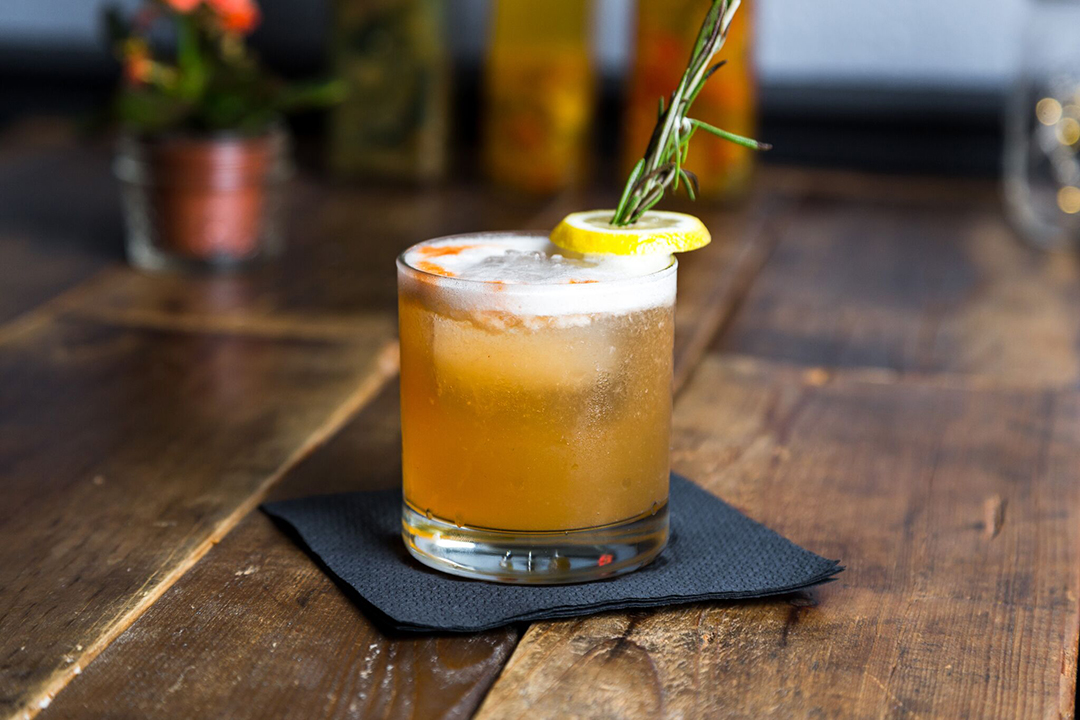 This classic drink with a twist is served with four roses bourbon, rosemary, dorset maple reserve syrup, and egg whites from Peaches Southern Pub & Juke Joint.