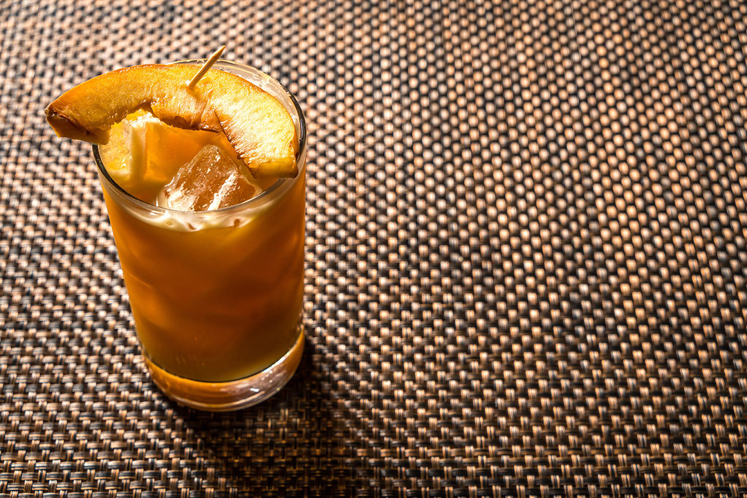This cocktail is made with papalote peach-infused mezcal, combier, passion fruit purée, lime juice, brown sugar, and walnut syrup from Brick Walk Tavern.
