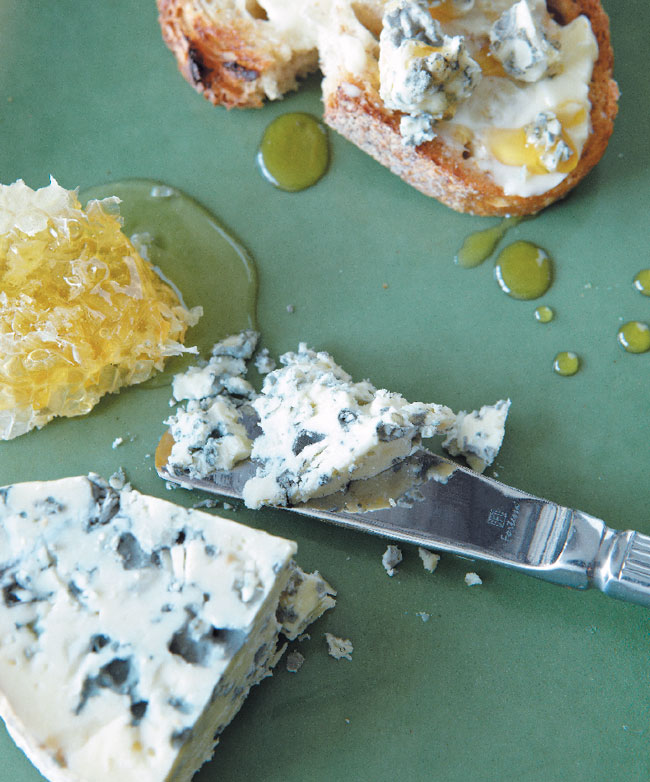 A Taste of Honey | Chef Kieffer likes to serve a crumbly Jasper Hill blue cheese on crusty bread with butter, drizzled with honey. Get this super simple recipe.