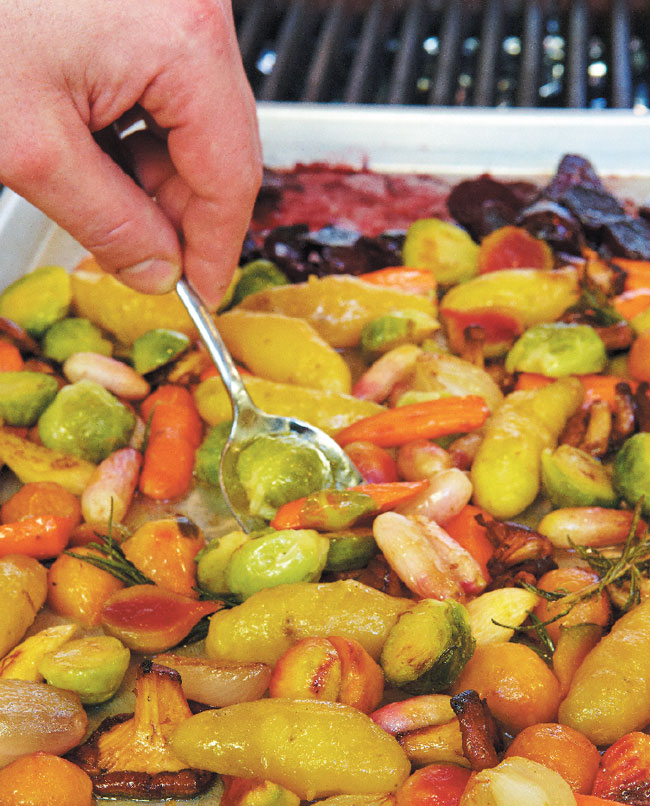Table Talk | Baby vegetables take on grown-up flavors when roasted and basted in a shallow pan. Be sure to cut the vegetables into uniform sizes, and roast the red beets separately, advises the chef. Get the Pan Roasted Winter Vegetables recipe.