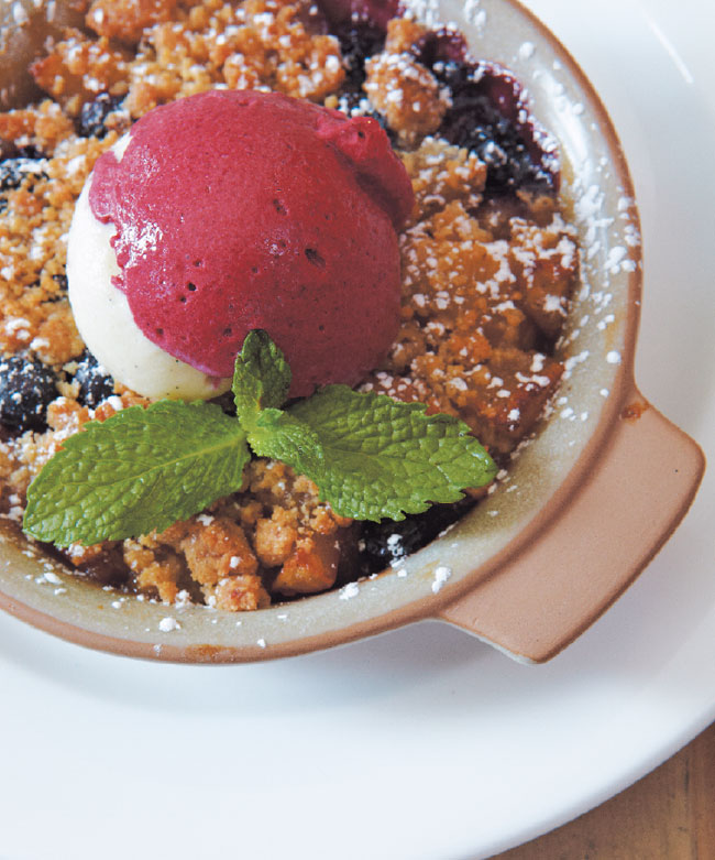 Prep School | The finished cobbler is dusted with powdered sugar and topped with generous scoops of homemade vanilla ice cream and blueberry sorbet. Get this stunning dessert recipe.