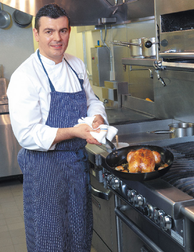 Kitchen Detail | Kieffer likes to bring the roast chicken and vegetables to the table in deep, handled pans and serve them family-style. Get the chicken recipe.