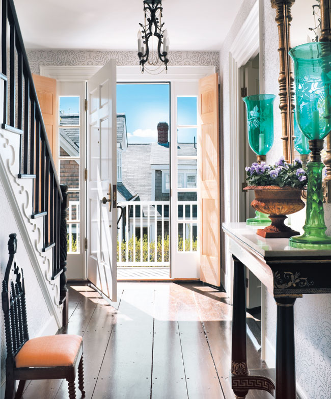 Builder Mark Godfrey helped create a new family home in Nantucket’s Historic District, while honoring the roots of the original home built in 1824. Wide-plank flooring and Kravet wallpaper complement Susan Zises Green’s extensive collection of antiques.