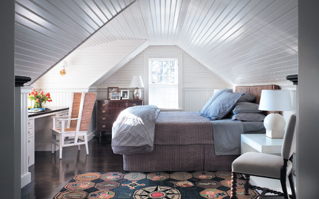 In the attic bedroom, the antique bureau is through Rafael Osona Auctions. The bed cover is through Roberta Roller Rabbit. The headboard is through West Elm. White bedside tables are through McGuire.