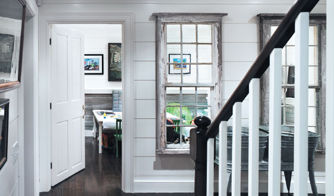 Antique windows that were salvaged from the original house offer a peek into the children’s playroom. Carolina Craft table and chairs are from Pottery Barn Kids.