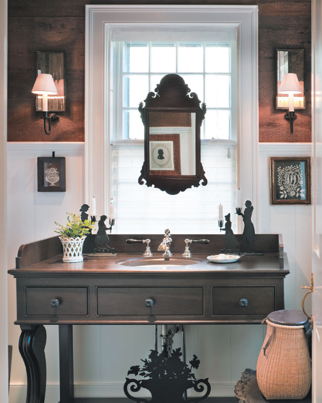 In the powder room, an antique mirror seems to float above a custom vanity with Waterworks sink and hardware. Rectangular mirror-back sconces are through Vaughan Designs.