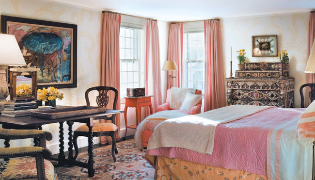 Rogers & Goffigon drapes and an antique bedspread set the palette for the master bedroom. Chaise fabric is through Pierre Frey.