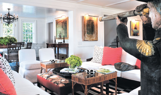 An antique statue of Lord Nelson stands watch over the living room. McGuire sofas are covered in Basic Linen Weave in Alabaster. Coral pillow fabric is through Clarence House. Dalmatian pillow fabric is through John Rosselli & Associates. Carpet is through ABC Carpet & Home.