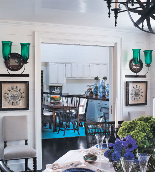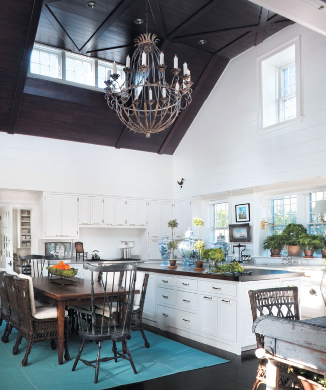 An antique chandelier draws all eyes upward in the kitchen. Black Windsor-style chairs are reproductions through the Nantucket Historical Association. Brass swing-arm lamps are through Val Maitino Antiques. Blue and white urns are through Bardith.