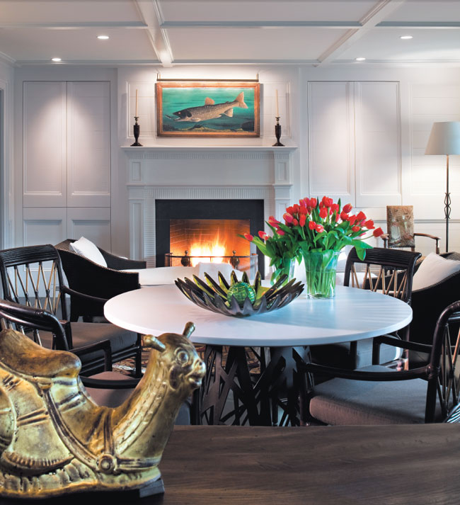 Russian Sunburst chairs surround a round Chaparral table with a bronze base and a pearl Staron top. A toboggan chaise invites lounging in front of the fireplace. The gold snail in the foreground is actually a child’s rocking horse.