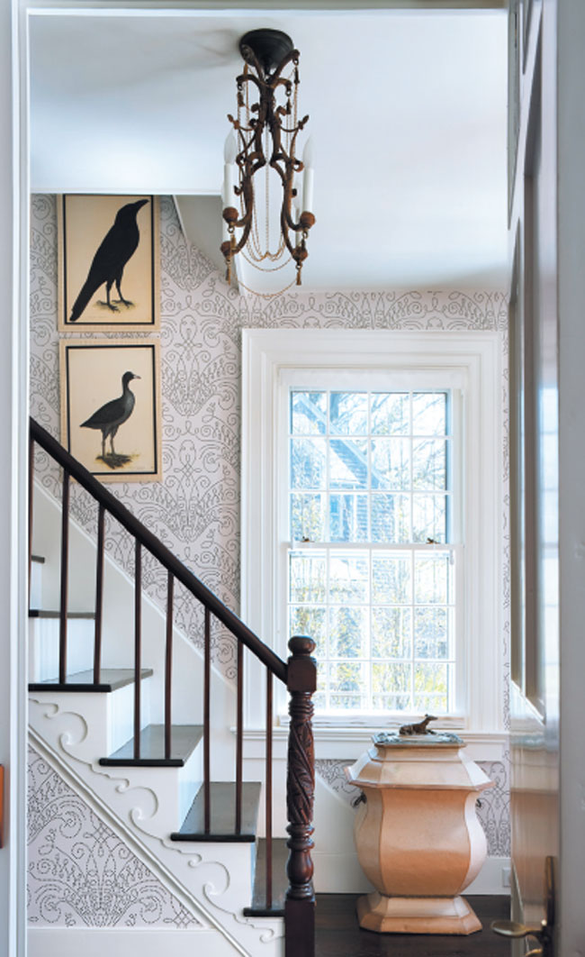 In the entry hall, an antique coal scuttle fits into a corner. Bird prints are by Olof Rudbeck.