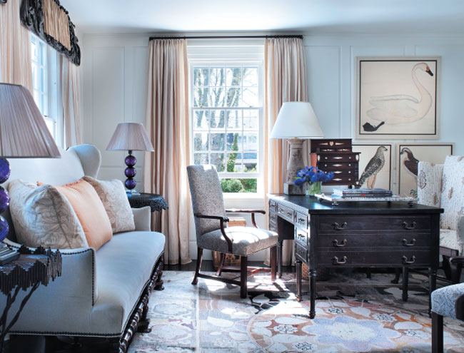 Drapes in the parlor are made from a Rogers & Goffigon fabric. Desk chair fabric is Chelsea Editions Central Park Sampler.