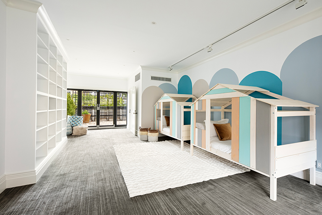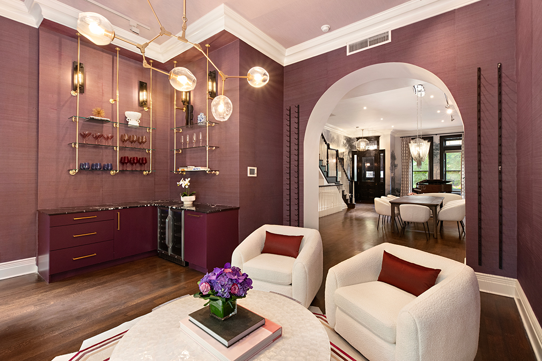 Beyond its quintessential rom-com location and brownstone facade, the five-bedroom home has a few other key romantic highlights. No need to splash out at a fancy bar when the parlor floor is perfect for date nights in. You can cozy up in the living area with a wood-burning fireplace and ethereal wallcoverings or head to the purple cocktail nook. While it’s technically the “library,” there are no books in sight currently. Just a built-in bar, wine refrigerators, and a Juliet balcony over the lovely garden just waiting for whispered conversations and star-gazing. However, if movies are your one true love, the basement’s home theater will likely become a beloved spot.