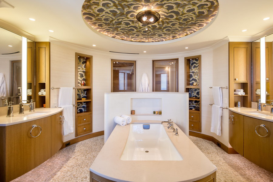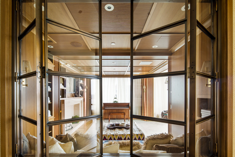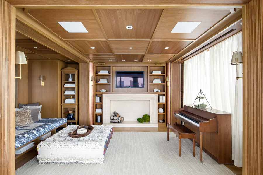 According to the listing, no detail was overlooked in appointing this glamorous space with the most deluxe materials. Oak panel flooring greets guests in the entry hall, where there is also a custom built-in banquette upholstered in a luxurious fabric and a dramatically lit fountain. The main level houses the corner living room, library, dining room family room and chef’s kitchen, all of which feature floor-to-ceiling wraparound windows with views of the Statue of Liberty and the Hudson River. The sprawling master suite is located on the upper level and includes an adjacent sitting room, minibar, two master bathrooms and a custom dressing room. Additional amenities include a personal gym, salon/barber shop and the option to be delivered both fully furnished and staffed.