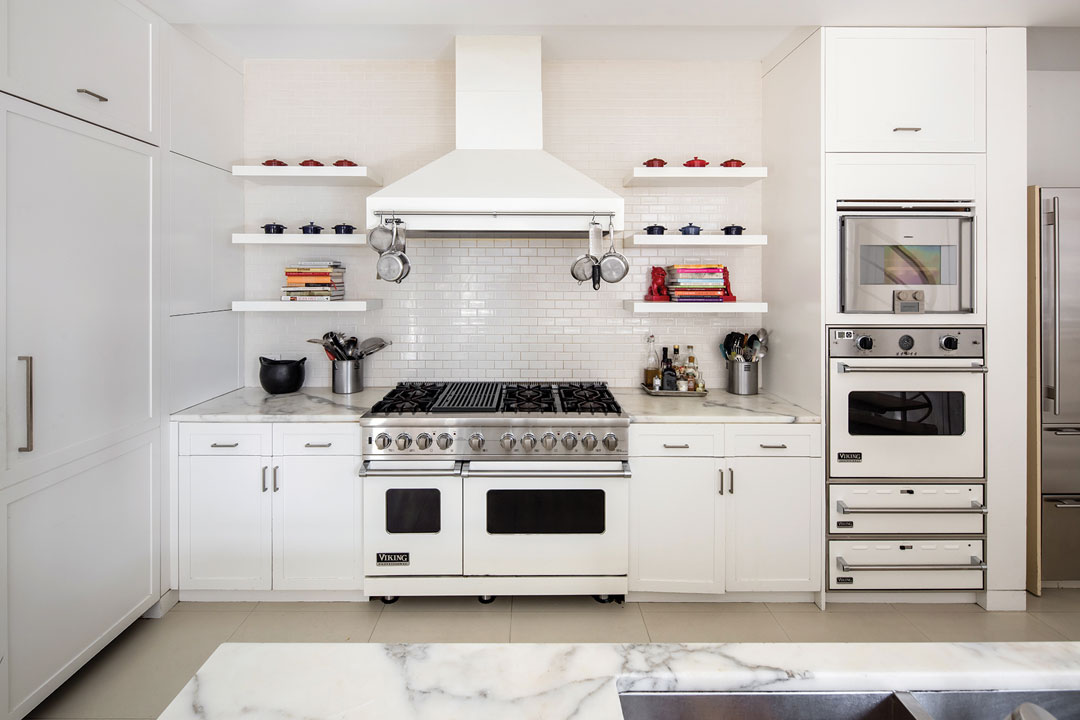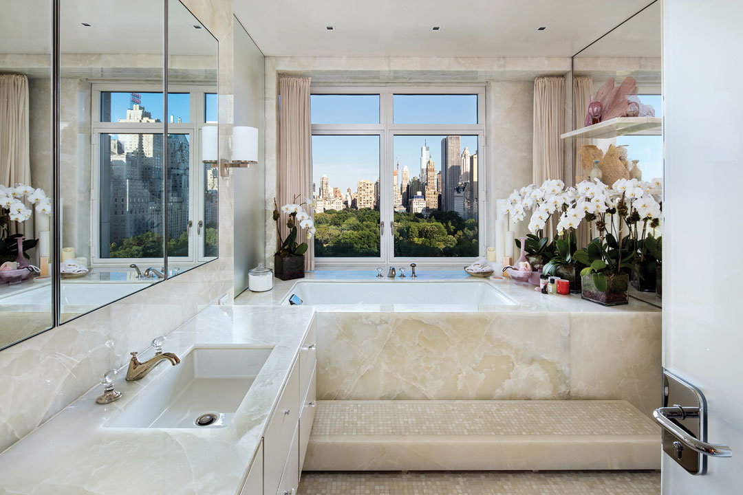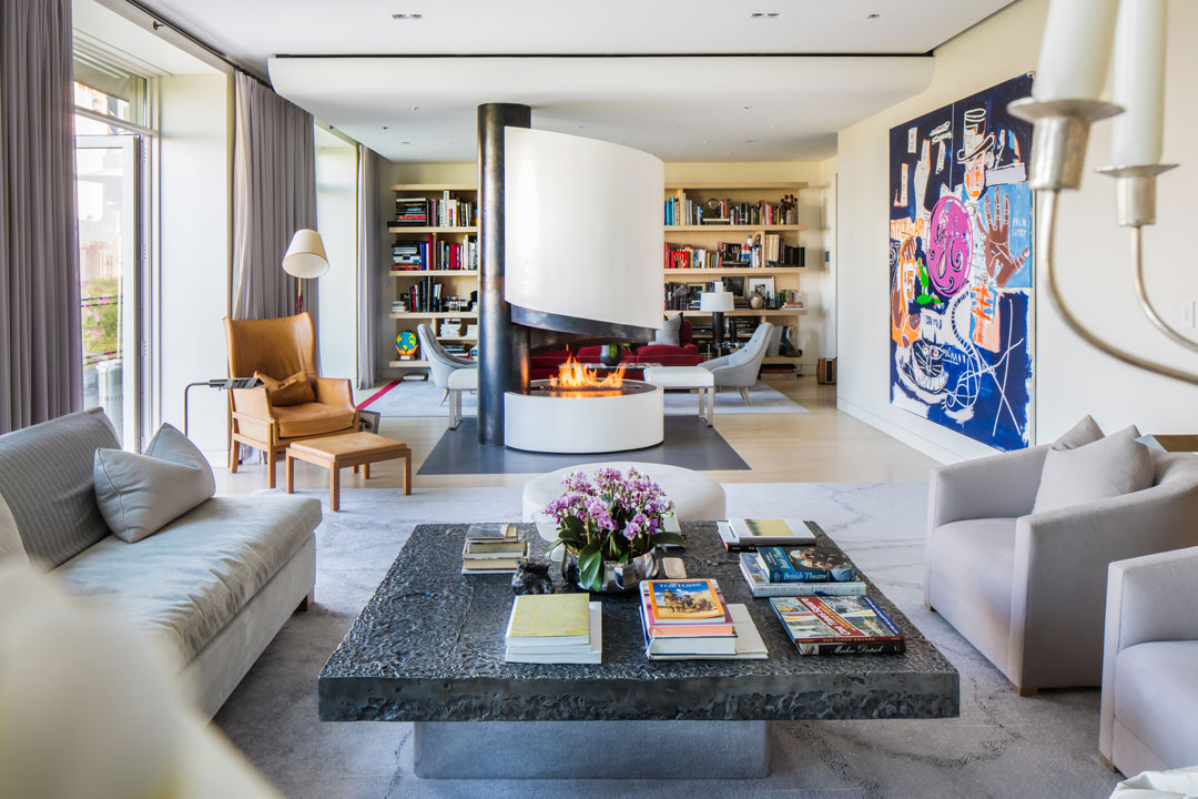 Sting and Styler were among the first buyers at the iconic Robert A.M. Stern-designed 15 Central Park West and picked up this residence for nearly $27M from the developer in 2008. The listing notes that the home was custom-designed for the couple by noted designer Lee Mindel of Shelton, Mindel & Associates, who added the 2 sculptural spiral staircases that access the upper level and provide architectural focal points. The 3-bedroom unit spans 5,417 square feet and features 10-ft ceilings throughout as well as multiple sets of glass French doors that access nearly 400 square feet of private terrace space. A unique gas fireplace feature separates the sprawling living room into 2 distinct areas: an entertaining-friendly formal sitting area and a cozy library lined with walls of built-in bookshelves. The other side of the residence houses an elegant dining room, a media room and a “designer chef’s catering kitchen” with 3 Miele dishwashers.
