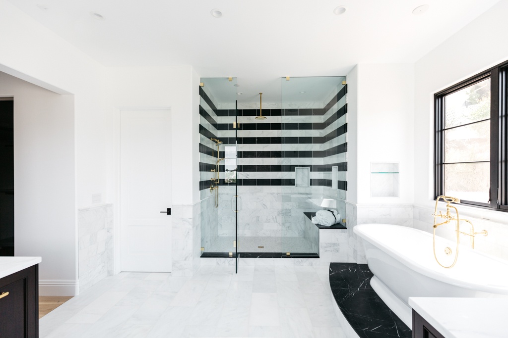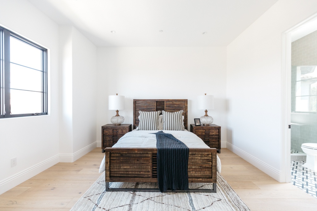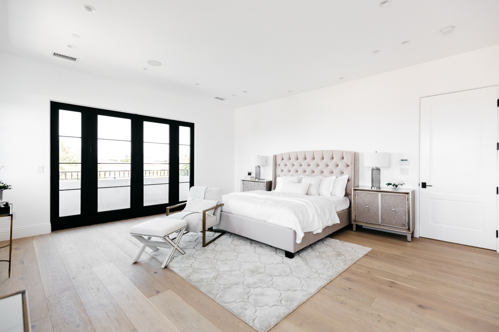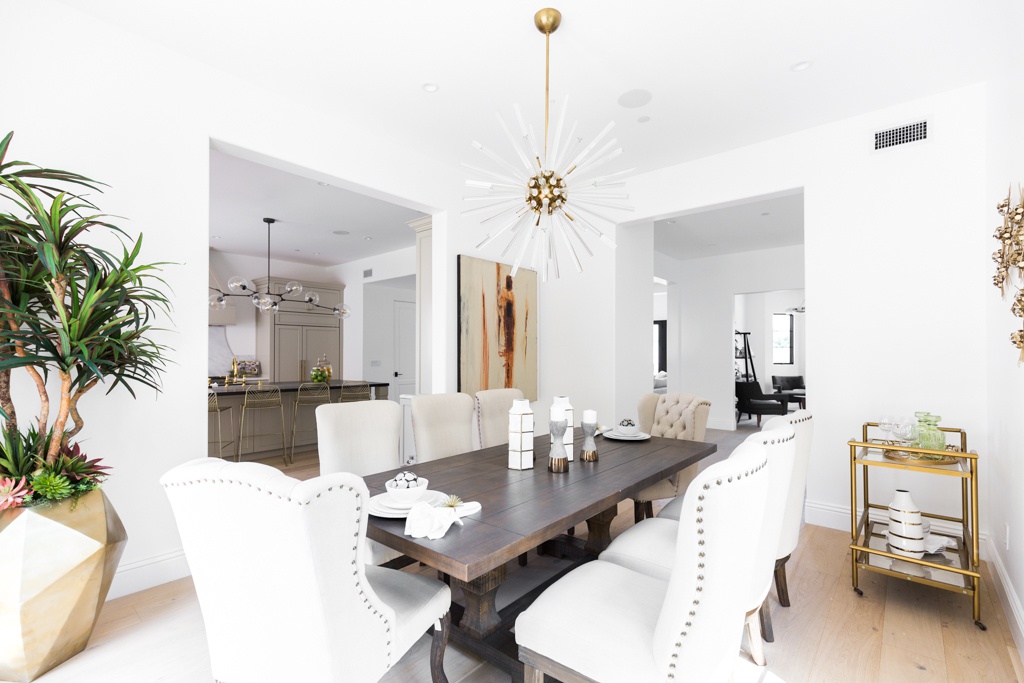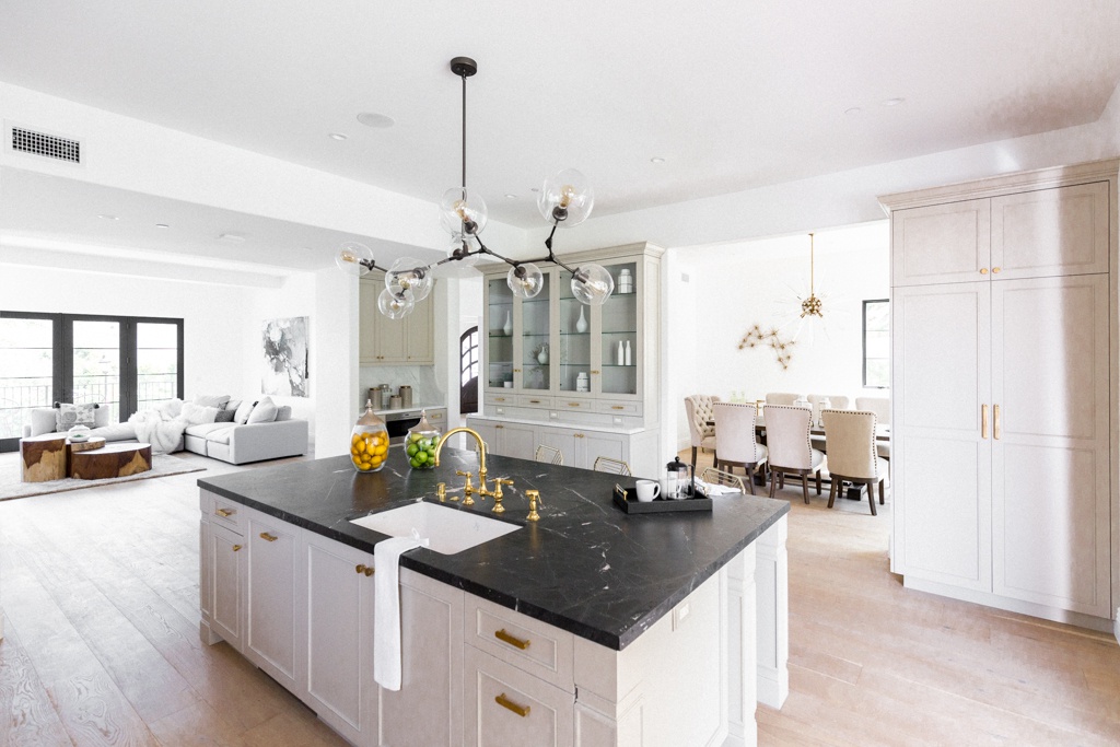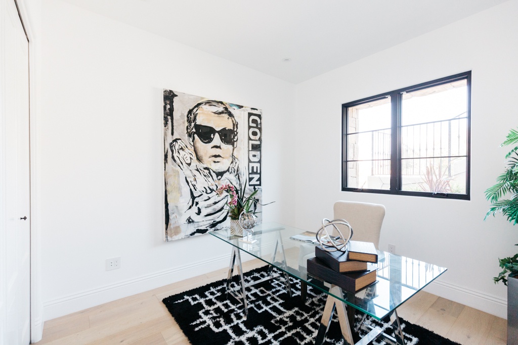 An open floor plan and crisp white walls create a bright and fresh environment throughout the home. California style shines in the kitchen with modern lighting fixtures and large Fleetwood doors that lead out to a veranda with a dining area. The spacious pad also offers luxurious finishes like Bianco Bella polished marble kitchen countertops, grass cloth wallpaper, penny round marble mosaic flooring, and custom cabinetry.