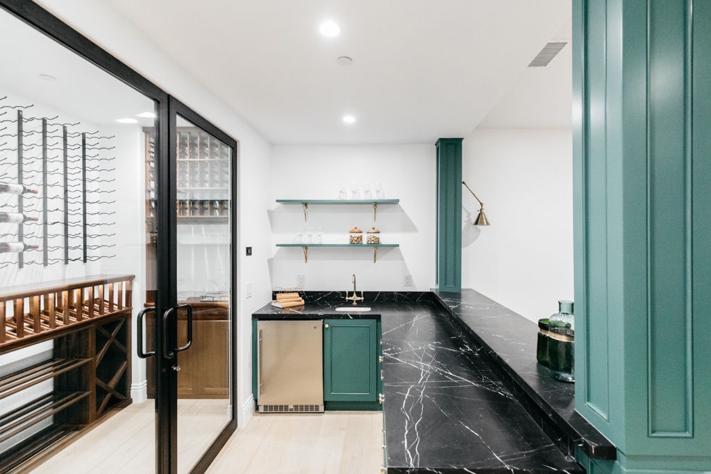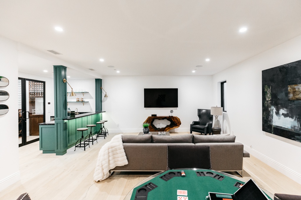 A den with a wet bar offers an open space to entertain, play games, and watch Grand Slam replays.