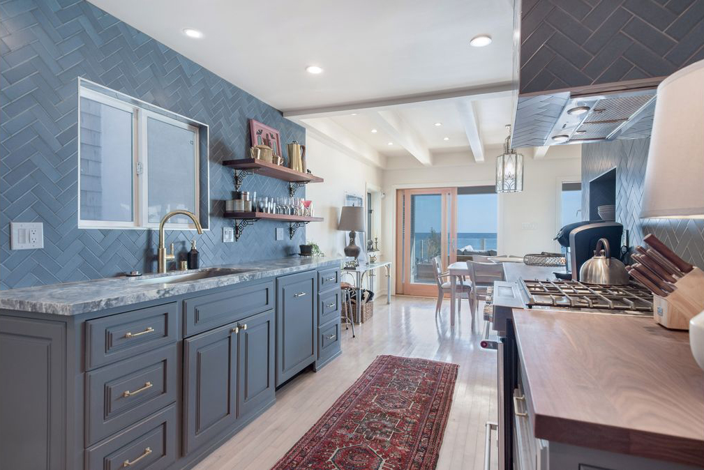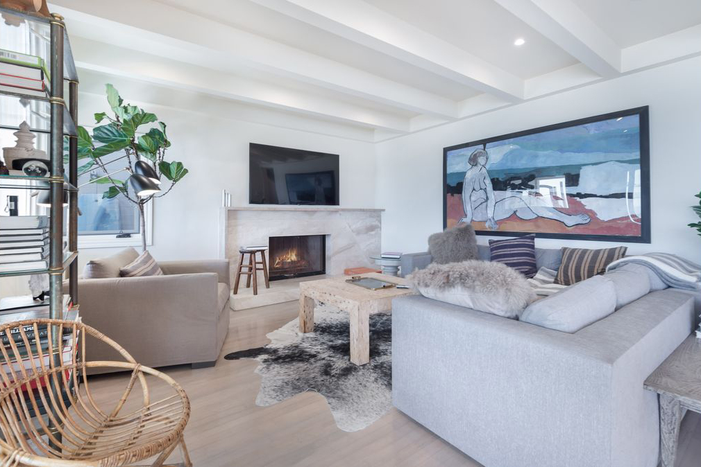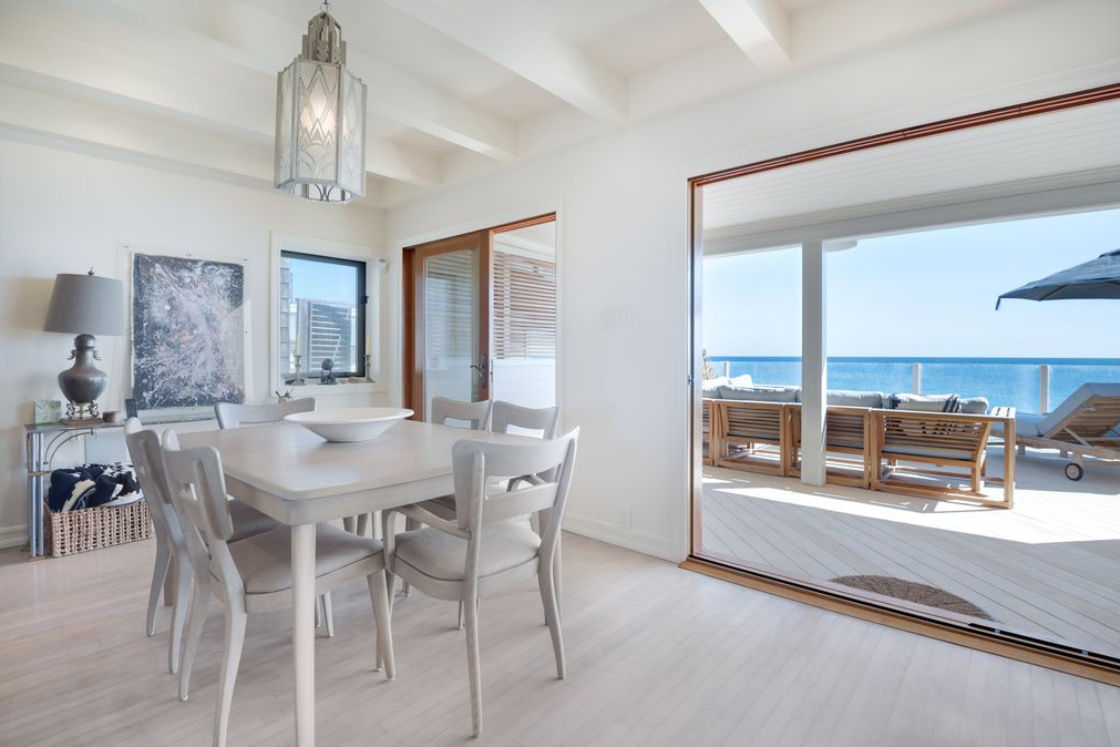 DiCaprio bought the home in 1998, but it has been recently renovated and now sports a sophisticated pale-on-pale palette and a modern-beach style. The living room features a marble fireplace and bleached-wood accents, while the galley kitchen has brand-new appliances and a herringbone backsplash that provides a pop of dark blue. Sliding glass doors lead out to the oceanfront deck, which has space for al fresco dining and relaxing. The home is ideally located on Carbon Beach, an exclusive stretch of oceanfront that is also known as “Billionaire’s Beach.”