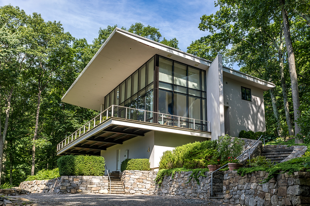 This Warren home takes advantage of killer views over Lake Waramaug and the Litchfield hills via its two-story walls of glass, some of which slide open to give access to a stunning wraparound deck. The modernist dwelling, built in 2004, resembles a glass box perched high on a hillside, grounded by rustic stone walls and steps. The 2.6-acre property also offers a separate artist studio.