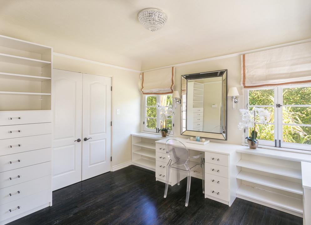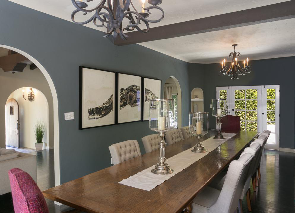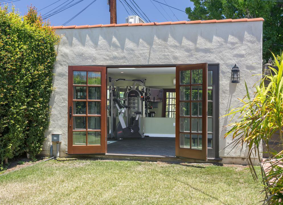 Some of the home’s best features are the cozy fireplaces and the spacious dining room, which could easily fit A Wrinkle In Time’s entire leading cast. The master bedroom boasts a cheery dressing room and bathroom with a splash of vintage green tile. There are some additional character-building traits outside. Head up the driveway, and you’ll come to a former garage/now fitness center with sky top roof. And perfect for a quick relax after a workout is the casually intimate yard adjacent to an intricate herringbone-patterned patio. It’s those interesting juxtapositions that make this, small-by-Hollywood-standards-bungalow an absolute delight.