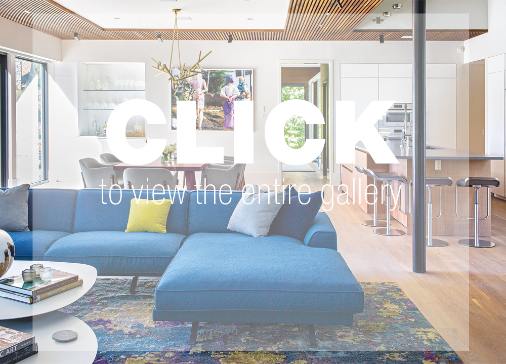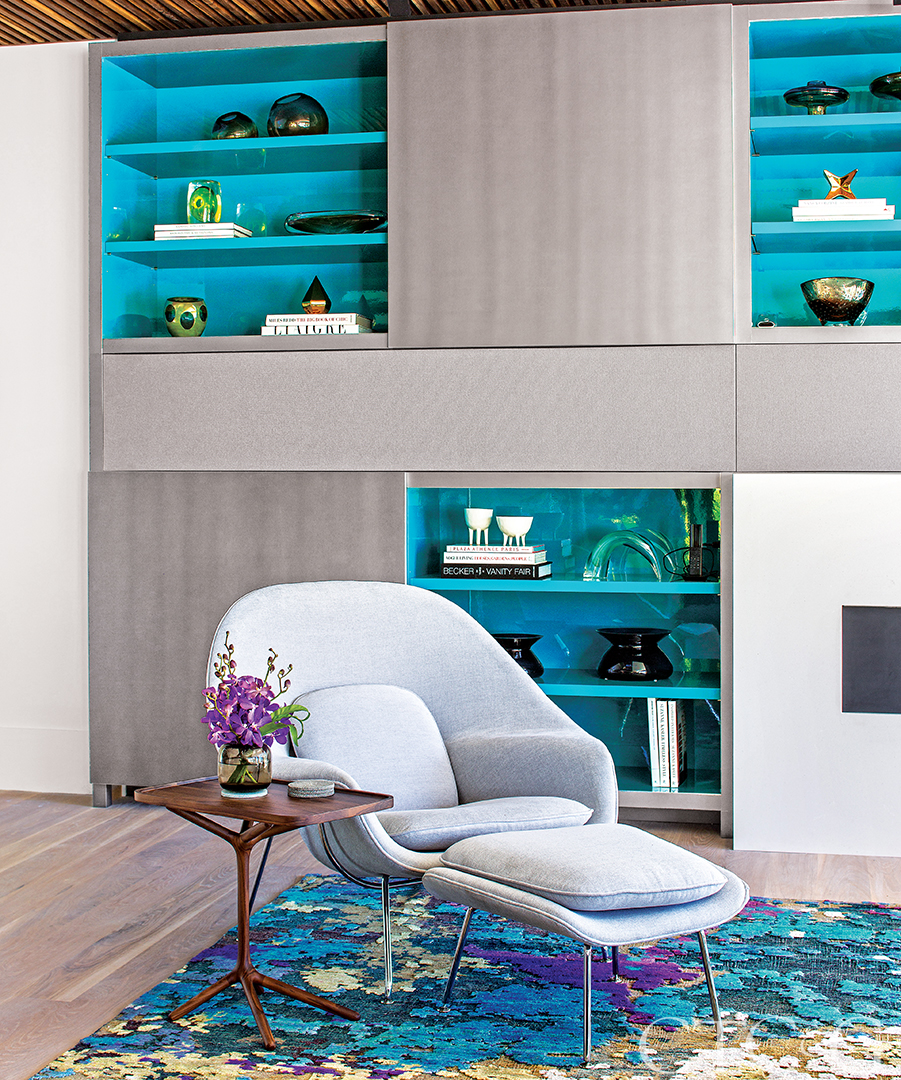 Which is not to say that the interiors are gallery-calm and restrained. A bright yellow mudroom, a family room punctuated by large-scale purple sofas, and a living room that pops with aqua-teal bookcases, periwinkle sofas and a multihued carpet, whose pattern references an image of earth as seen from the moon, reveal a strong and calculated aesthetic. “When I showed the client some of these colors, she said ‘yes’ to them all,” says Zolin. “Her personality came through and so did that of the house.” Bartolotta added his own signature by tracing portions of the ceiling with slats of oiled walnut for what he calls “a corduroy treatment and a way to designate zones.”