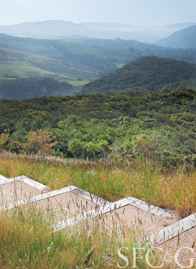 The lovely moments in landscape when a path descends into a wide, wild field or a thatch of lavender frames a solitary tree are what 18th- and 19th-century aesthetes considered picturesque. Every landscape is a painting, they contended, but, one might ask, how do you render the Romantic on land that flatly resists it? This was the question facing leading landscape architect Bernard Trainor when he was commissioned to cultivate an inhospitable home site in Carmel. Trainor, however, who grew up on Australia’s rugged southern coast, isn’t one to shrink from a challenge. “I like it when things are a bit more difficult, I think that’s when I’m at my best,” he says. True to that ethos, Trainor transformed the resistant terroir into a landscape that would have delighted our pictorial theorists.
