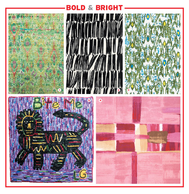 1. Angela Adams’ Garden rug from the Pathways Collection. Hand-tufted New Zealand wool, 800-255-9454, angelaadams.com. 2. Pink Zebra rug, from the Wild Things Collection. Pure handspun, hand-knotted and botanically dyed silk. Carini Lang, NYC, 646-613-0497, carinilang.com. 3. Ikat #4 from Luke Irwin. Made in India, Persian hand-knotted wool, lukeirwin.com. 4. From the Soho Collection, SOH727A, hand-tufted New Zealand wool and organic viscose, Safavieh, safavieh.com. 5. The Oriental 89992 from Stark in art silk, (T), Norwalk, 203-899-1771, D&D Building, NYC, 212-752-9000, starkcarpet.com. 6. Rug Company’s Peacock light, by Matthew Williamson, Tibetan wool and silk, NYC, 212-274-0444, therugcompany.com.