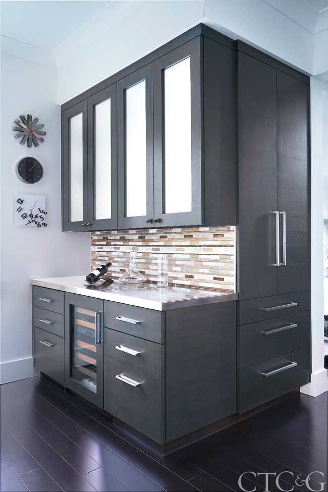 Family room and kitchen were united by removing the wall between the two and installing a waterfall glass-topped peninsula with seating on one side and cabinet storage on the other. This mirrors the center island, which is similarly topped with luminescent cast glass. A custom floating banquette by Audrey Sundheimer Interior Design in the windowed corner creates a casual dining area while leaving space for a bar with wine storage, a tall pantry and even a computer workstation with ridged-glass door inserts. “While the kitchen size remains similar to what it was prior to renovation, it feels far more spacious and has infinitely greater interest with a combination of dark, rift oak stained cabinetry and painted upper cabinets along the perimeter,” notes Santoro.