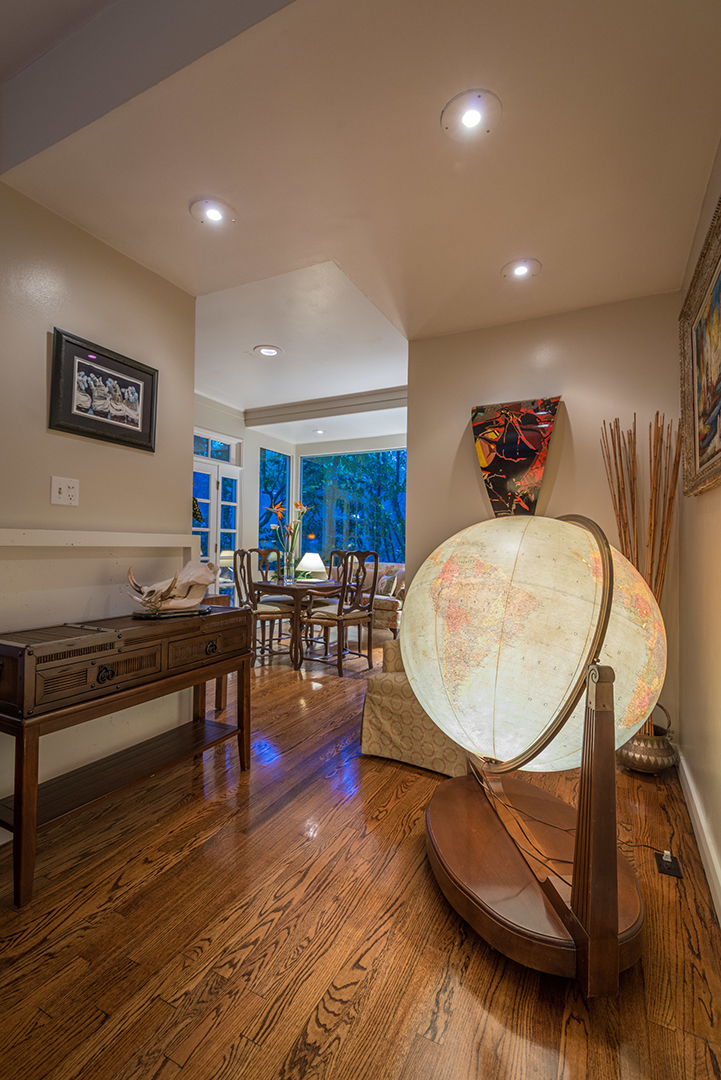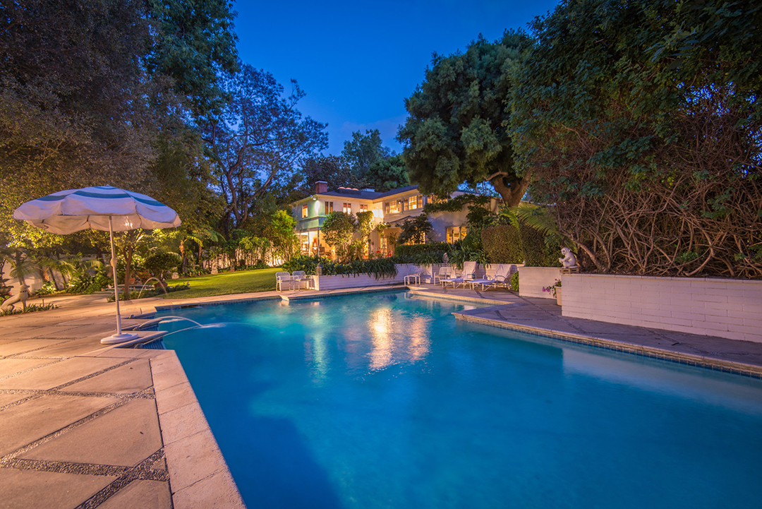 The 7,000-square-foot estate was built by architect-to-the-stars Paul Williams and features a mirrored foyer, living and family rooms with wood burning fireplaces, a formal dining room, a casual breakfast room and a well appointed kitchen on the entertaining level and 4 bedroom suites upstairs. The property includes a private tennis court, landscaped gardens, several patios and a large pool along with a guesthouse and staff apartment.