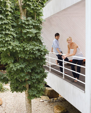 “We’re living in the trees, at eye level with leaves and branches,” says Scott Formby. “One wall of the main room is all glass, so as the trees change with the seasons, the color of the room changes too.” The Formbys are so fond of the two-acre property’s established beeches and oaks that they scrapped the idea of a swimming pool because, as Kathy says, “We just didn’t have the heart to chop down the trees.”