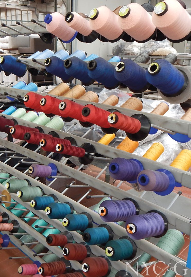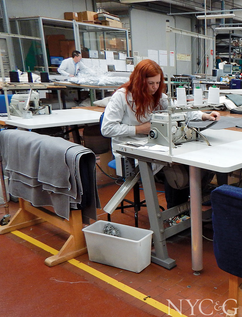 The place where such iconic sofas as the Magister (sort of a revved-up modern Chesterfield with bolsters), the Evergreen (a chic seating piece with a slight nod to Knole), and the Max (a tubular wonder that dawned as the days of disco were waning) are crafted is a hive of efficiency and organization. Constructed from wood or metal frames—the latter given a polyurethane shell for extra strength and comfort—all furniture gets foam padding and hand-applied upholstery (sometimes two layers of it), which is fitted snugly with an eco-safe adhesive so that employees need not wear masks. Webbing is done by hand, as the right tension and support cannot be gauged by machinery. Much of Flexform’s fabrics, however, are cut by machine, and the company stocks hundreds of patterns, although clients can opt for C.O.M. (Fabric templates for every piece in the archive are kept in large green plastic sleeves.) As for leathers, employees check them for infinitesimal flaws before they are scanned into a computer and cut by laser. Any imperfection is circled with a yellow grease pencil, with the computer programmed to excise the flaws while minimizing waste. Extra delicate materials, like creamy houndstooth cashmeres, must be cut by hand.