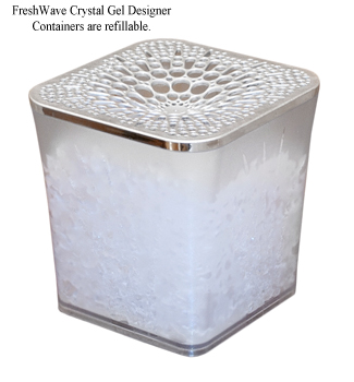 Odorless FreshWave Crystal Gel, composed of water and extracts of lime, pine needle, aniseed, clove and cedar wood, eliminates household odors without harsh chemicals or masking fragrances. New frosted glass containers with lacy chrome tops hold pouches of gel that are exposed to room odors. The refillable containers, which complement room decor come with 18 ounces of gel which lasts 2-3 months. Once spent, the gel can be replenished using large economy packs, which are lower in cost than smaller replacement sizes. www.freshwaveworks.com