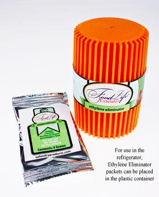 Fruits and vegetables spoil more slowly when the naturally occurring ethylene gas that ripens them is removed. Pouches of Ethylene Eliminator placed in the refrigerator absorb the gas so that the food lasts longer. Sachet pouches of the substance can be put directly into the fridge or encased in the plastic refrigerator unit. www.desiccare.com