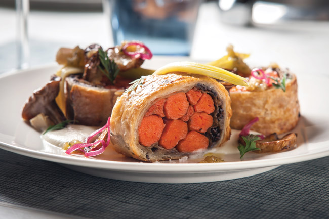 Veggie: Carrots Wellington ($24). “The carrots are roasted with cinnamon, coriander, and fennel, cooled, then wrapped in puff pastry and baked again,” says chef John Fraser. “We serve it with bluefoot mushrooms, baby leeks, pickled pearl onions, roasted sunchokes, and sunchoke puree.”