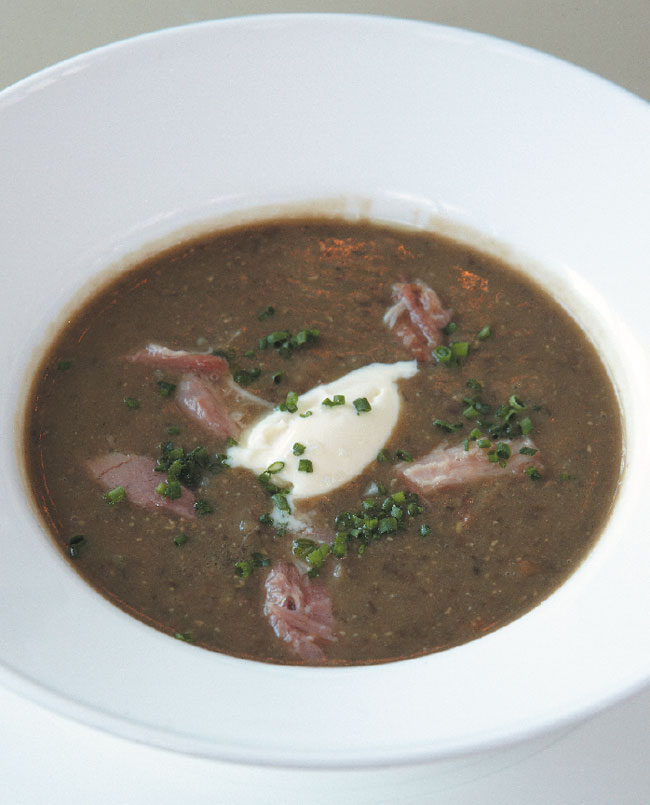 Green Lentil and Smoked Ham Hock Soup with Wilted Chard